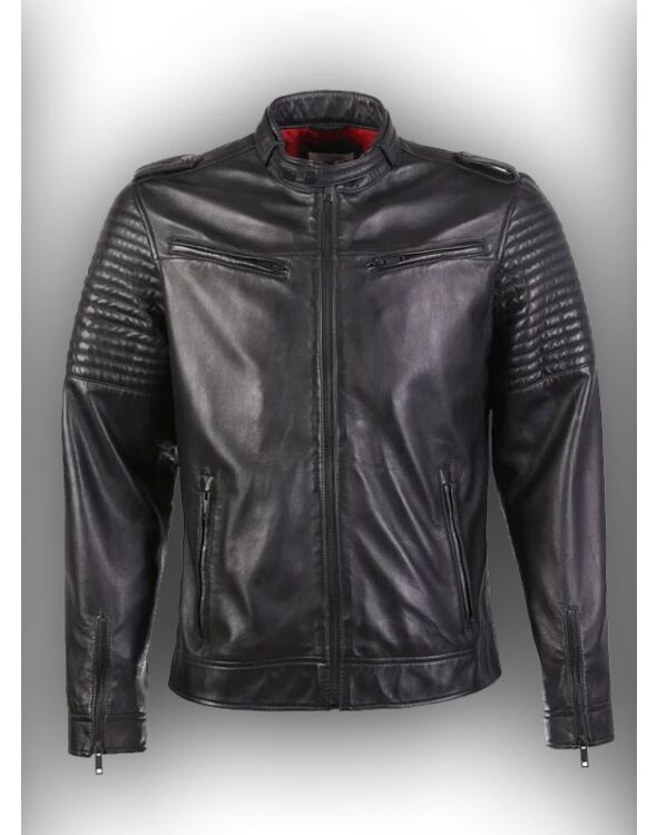 This leather jacket has bold ribbed details on the sleeves under shoulder edges. Made with premium Sheep Leather for suppleness and comfort. Very bold racing Style Leather Jacket with red satin/polyester lining. This jacket can be worn on multiple occasions or casually.